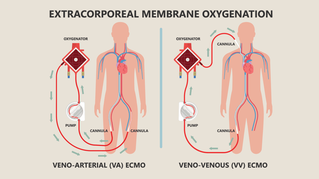 La oxigenación por membrana extracorpórea (en inglés, Extracorporeal Membrane Oxygenation) es una técnica de soporte vital utilizada en pacientes con insuficiencia respiratoria o cardíaca grave. Consiste en un sistema que oxigena la sangre fuera del cuerpo,  permitiendo que los pulmones y el corazón descansen y se recuperen. La ECMO puede ser veno-venosa (VV), que proporciona soporte respiratorio al extraer sangre de una vena, oxigenarla y devolverla al sistema venoso; o veno-arterial (VA) que ofrece soporte tanto respiratorio como cardíaco al extraer sangre de una vena, oxigenarla y devolverla al sistema arterial.